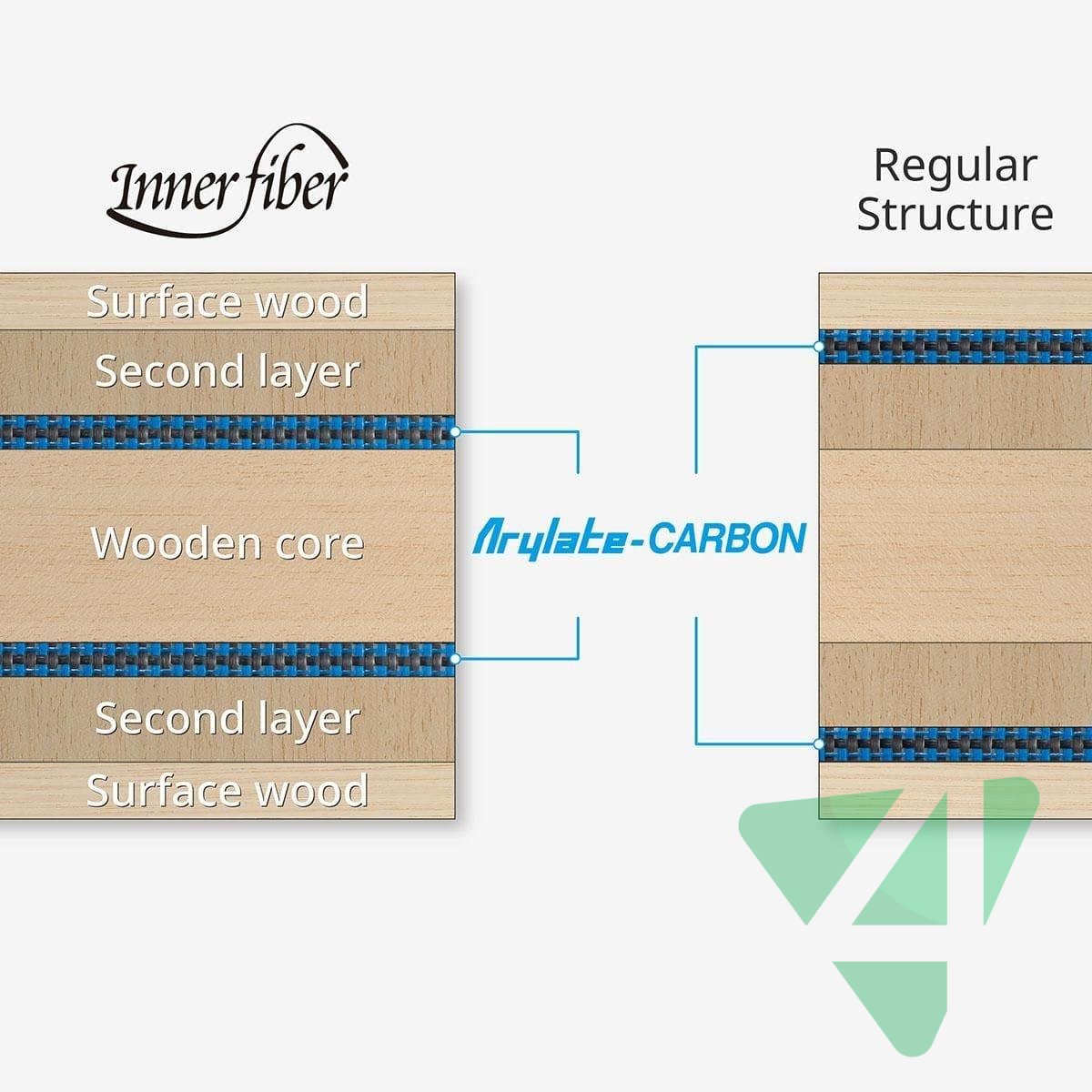 - Особенность ощущения: Наличие двух слоев мягкого дерева перед карбоном обеспечивает мягкий контакт и ощущение чистого дерева при слабых ударах, тогда как карбон включается при сильных атаках.