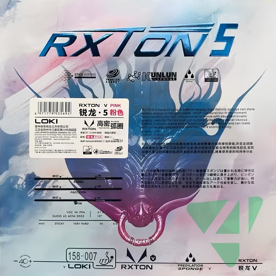 LOKI Rxton 5 Purple — это атакующая накладка, разработанная для динамичной и агрессивной игры. Комбинация упругой оранжевой губки и верхнего слоя с лёгкой китайской липкостью даёт хороший старт по скорости, а низкий угол выброса делает её особенно интересной для тех, кто играет «вперёд».