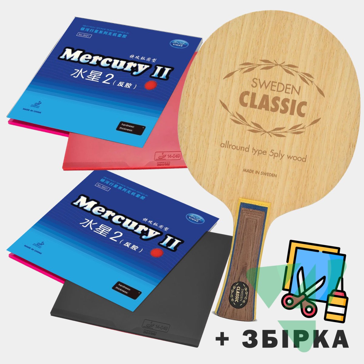 Sweden Classic — класична 5-шарова дерев’яна основа з м’яким відгуком і дуже приємним контактом. Вона добре «тримає» м’яч, дозволяє спокійно працювати в топспіні, блоках і короткій грі. Mercury II логічно підсилює цю ідею: накладка чіпка, спінова, контрольна, без надмірного катапультуючого ефекту. У підсумку виходить комплект, який прощає більше, ніж жорсткі й швидкі сучасні зв’язки, але при цьому не робить гру нудною.